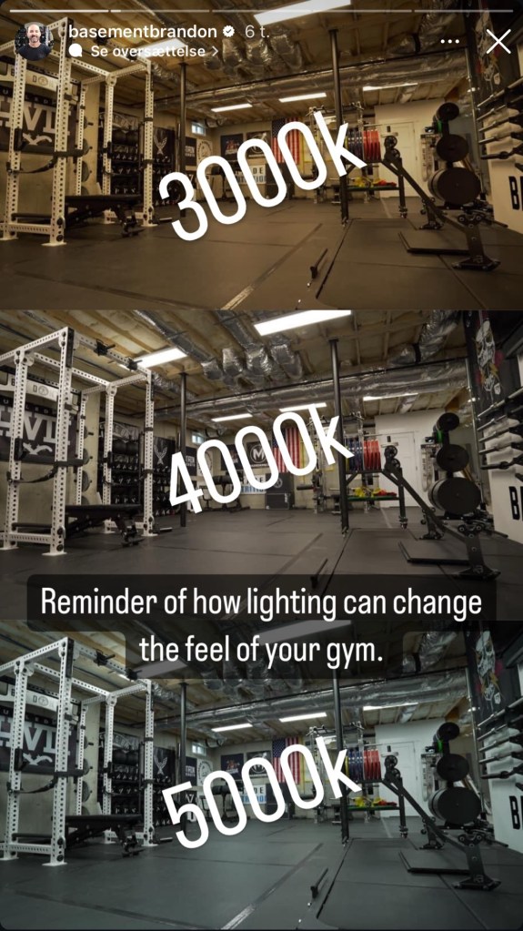 I get more energy in a brightly lit setting with the lighting being towards the colder white or blue end of the spectrum. Look for the Kelvin rating of the light bulb. You want 4-5K Kelvin for the classic crisp gym light (see picture below). This will also help distinguish your home gym from the rest of your home.