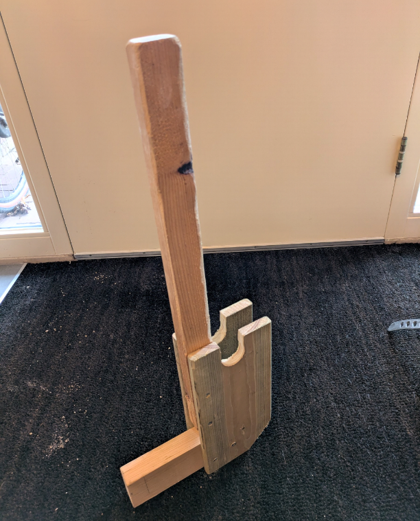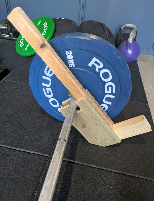 You need to add a notch for catching the barbell to your wooden beam. Also, incorporate a 45 degree cut-out at the bottom (see pictures above). The cut-out will help with the lever rocking motion. The lowest height of the notch, where the barbell rests when lifted, should be at least 235 mm of the floor. This way, the barbell will be lifted 10 mm off the floor (most Olympic weight plates are 450 mm in diameter). Next, you could increase its stability by making the bottom/foot more wide. Or you could paint it to match your home gym..